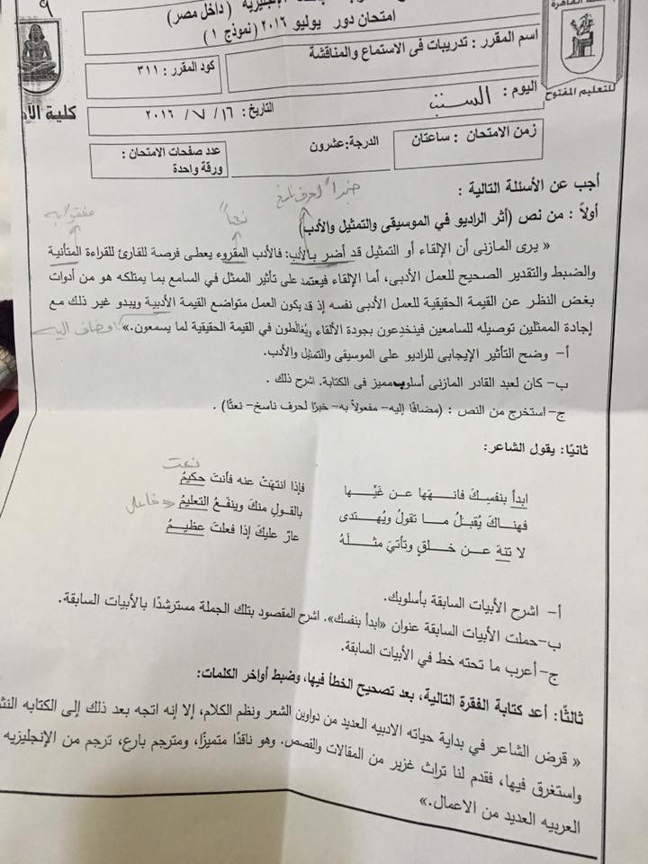 إمتحانات سابقة Faculty Of Art 5th Semester April 2016